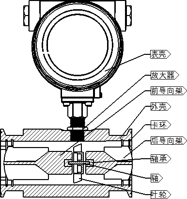 圖所示為渦輪流量傳感器結(jié)構(gòu)簡圖,由圖可見,當(dāng)被測流體流過傳感器時(shí),在流體作用下,葉輪受力旋轉(zhuǎn),其轉(zhuǎn)速與管道平均流速成正比,葉輪的轉(zhuǎn)動(dòng)周期地改變磁電轉(zhuǎn)換器的磁阻值。檢測線圈中的磁通隨之發(fā)生周期性變化,產(chǎn)生周期性的感應(yīng)電勢,即電脈沖信號(hào),經(jīng)放大器放大后,送至顯示儀表顯示。