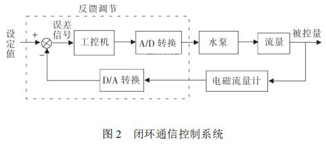 通信控制系統(tǒng)由工控機、變頻器、水泵、數(shù)據(jù)采集卡、化工污水流量計等組成。在整個熱量表耐久性試驗裝置中,化工污水流量計與被試驗熱量表串聯(lián)在試驗管路中。系統(tǒng)設(shè)定流量值 qs,通過工控機發(fā)送信號給變頻器,來控制水泵運轉(zhuǎn),系統(tǒng)通過研華數(shù)據(jù)采集卡 PCI1711 將采集到的化工污水流量計當(dāng)前瞬時流量值反饋給工控機,工控機將返回流量值與設(shè)定流量值qs進行比較,從而確定是否需要重新調(diào)整變頻器頻率控制水泵轉(zhuǎn)速。此過程是一個完整的閉環(huán) PID 控制過程,其閉環(huán)控制過程如圖 2 所示。 2. 2 管路切換系統(tǒng)管路切換主要由冷熱水箱、水泵、開關(guān)閥等組成。要實現(xiàn)熱量表耐久性 4000 次冷熱沖擊試驗,需要實時控制管路中熱水與冷水的交替使用。